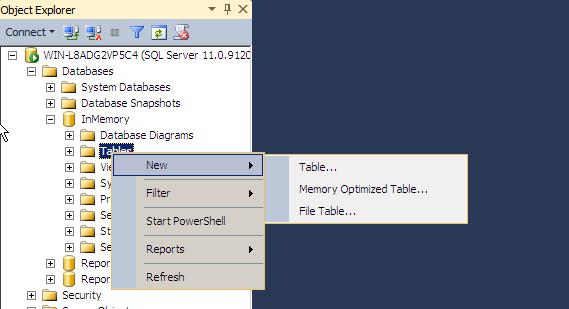 پس از فعال شدن قابلیت فوق، می توانیم جداول Memory-Optimized مورد نظر خود را با دستور T-SQL اضافه کنیم. دستور زیر جدولی با عنوان InMemoryProduct را به صورت Memory-Optimized Table به بانک اطلاعاتی اضافه می نماید: